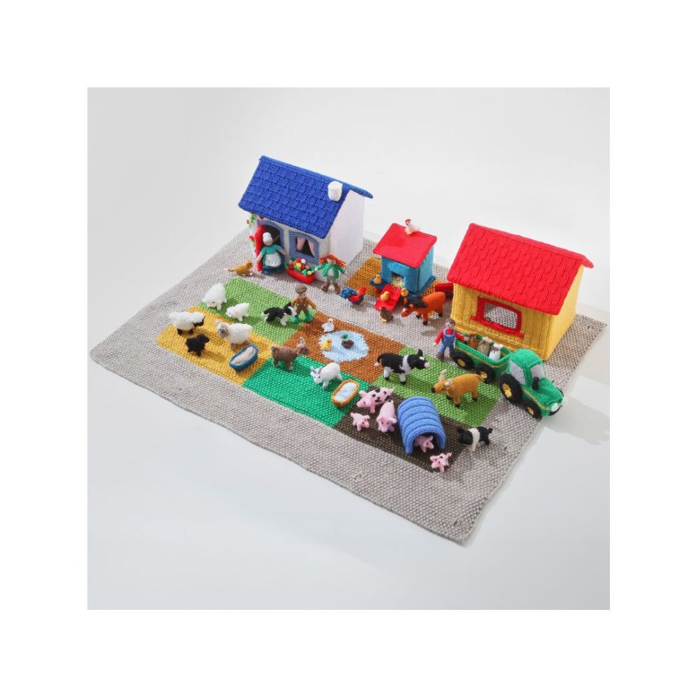 Designed by the talented Sue Jobson, these projects are ideal for intermediate knitters and use DK yarns for soft, cuddly results. Each pattern includes clear instructions, assembly guides, and material requirements. This knitted farmyard folds flat after use and includes a pattern for a storage bag.