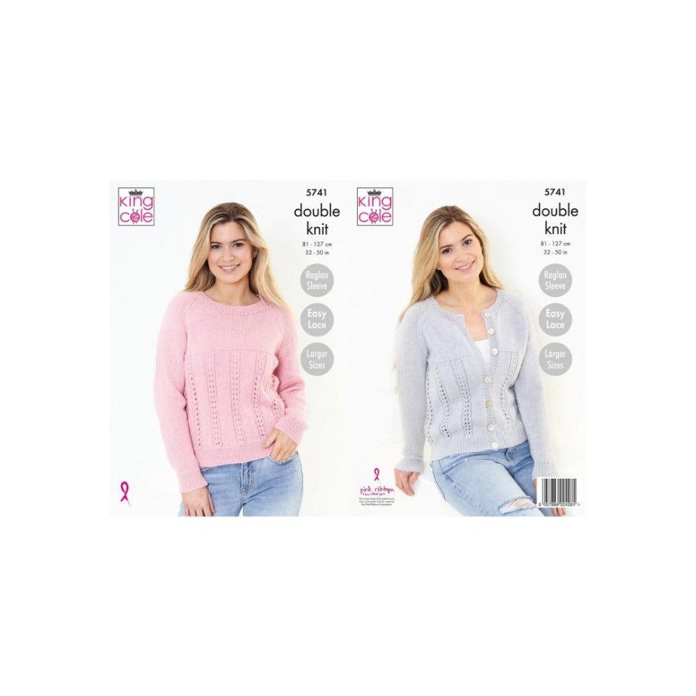 King Cole pattern 5741 is for a ladies easy lace raglan sleeve cardigan and sweater to fit sizes 81 - 127 cm / 32 - 50 in.